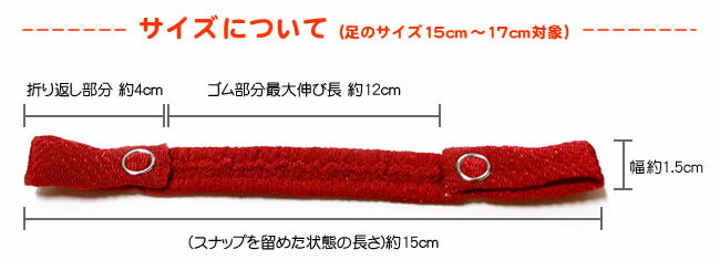 素材:ポリエステルサイズ:(スナップを留めた状態)長さ約15cm、(ゴム最大伸び長)約12cm幅 約1.5cm足サイズ:15cm〜17cm中国製5個までメール便可能。