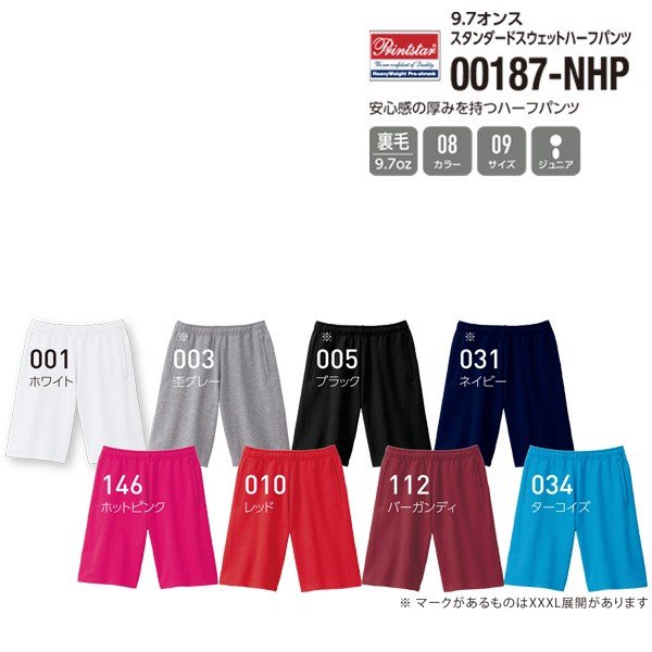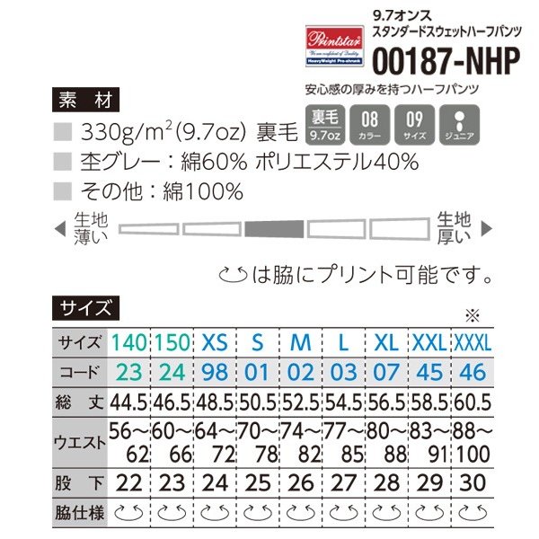 プリントスター 無地 スウェットパンツ 00187-NHP 9.7オンス NHP スタンダードスウェットハーフパンツ XS〜XLトムス187SALEセール