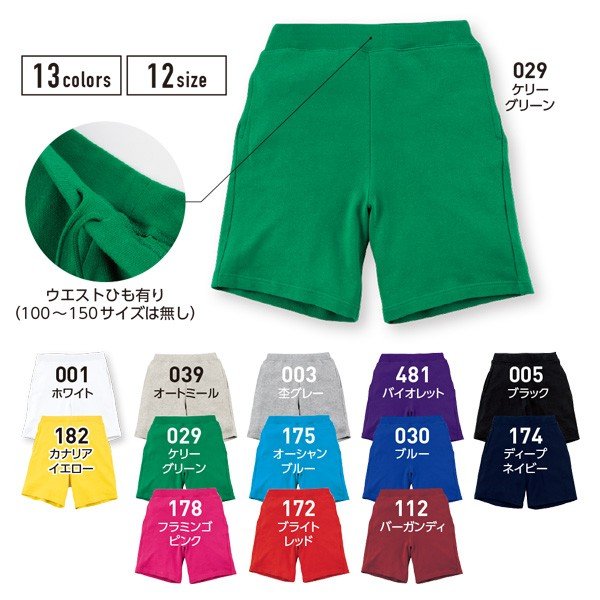 会社名やお店の名前をプリントし制服として、また選挙やサークル、運動会・体育祭・学園祭・ライブなどのイベント用ユニフォームとして利用することでチームの一体感が増します ●Printstar プリントスター スウェットハーフパンツ 00220 8.4オンス MHP ライトスウェットハーフパンツ カラフルでキッズサイズ充実のライトな履き心地 生地:裏毛8.4oz バリエーション:レディース・ジュニア 素材 285g/m2(8.4oz)裏毛 杢グレー・オートミール:綿93% ポリエステル7% その他:綿100% 生地厚2:薄い ・☆