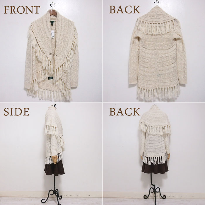 ラルフローレン ローレン レディース フリンジ フィッシャーマン ニット カーディガン/クリームLAUREN by Ralph Lauren knit Cardigan ◆輸入品販売に関しまして諸注意◆ ※新品、未使用品となりますが 購入先による背中付近に防犯タグのピン穴 形を整えるための針孔がございます。