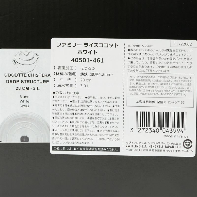 【全国一律送料無料】【ホワイト】STAUB ストウブ 鍋 20cm 無水鍋 無水調理鍋 煮込み鍋 ファミリー ライスコット ライスポット 3.0L ストゥブ staub 両手鍋 ホーロー 鍋 おしゃれ キッチン【40501-461】